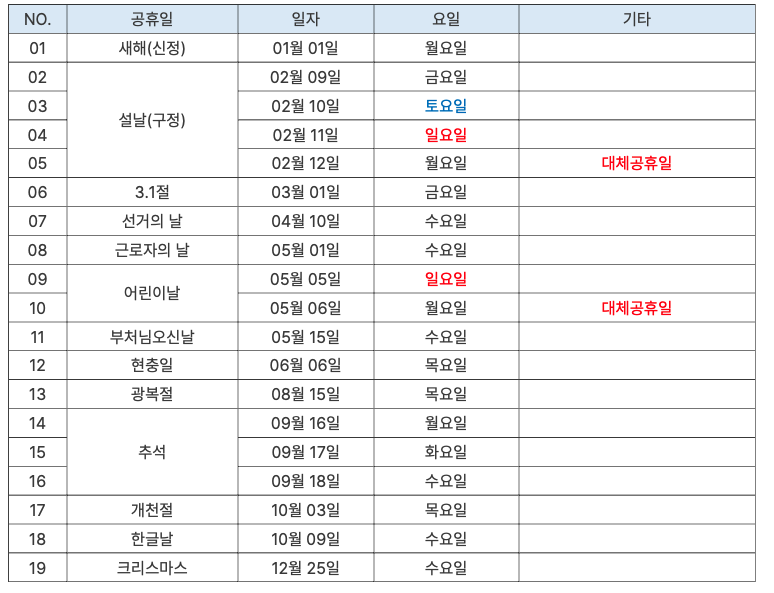 휴일은 먼저 국경일, 공휴일, 법정공휴일, 법정 휴일, 토요일로 나눌 수 있는데요.